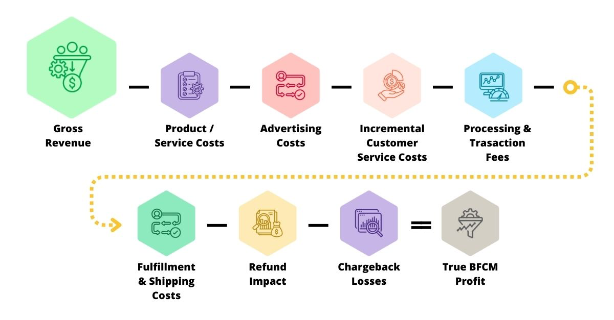 Gross Revenue minus Product/Service Costs minus Advertising Spend minus Incremental Customer Service Costs minus Processing and Transaction Fees minus Fulfillment and Shipping Costs minus Refund Impact minus Chargeback Losses equals True BFCM Profit