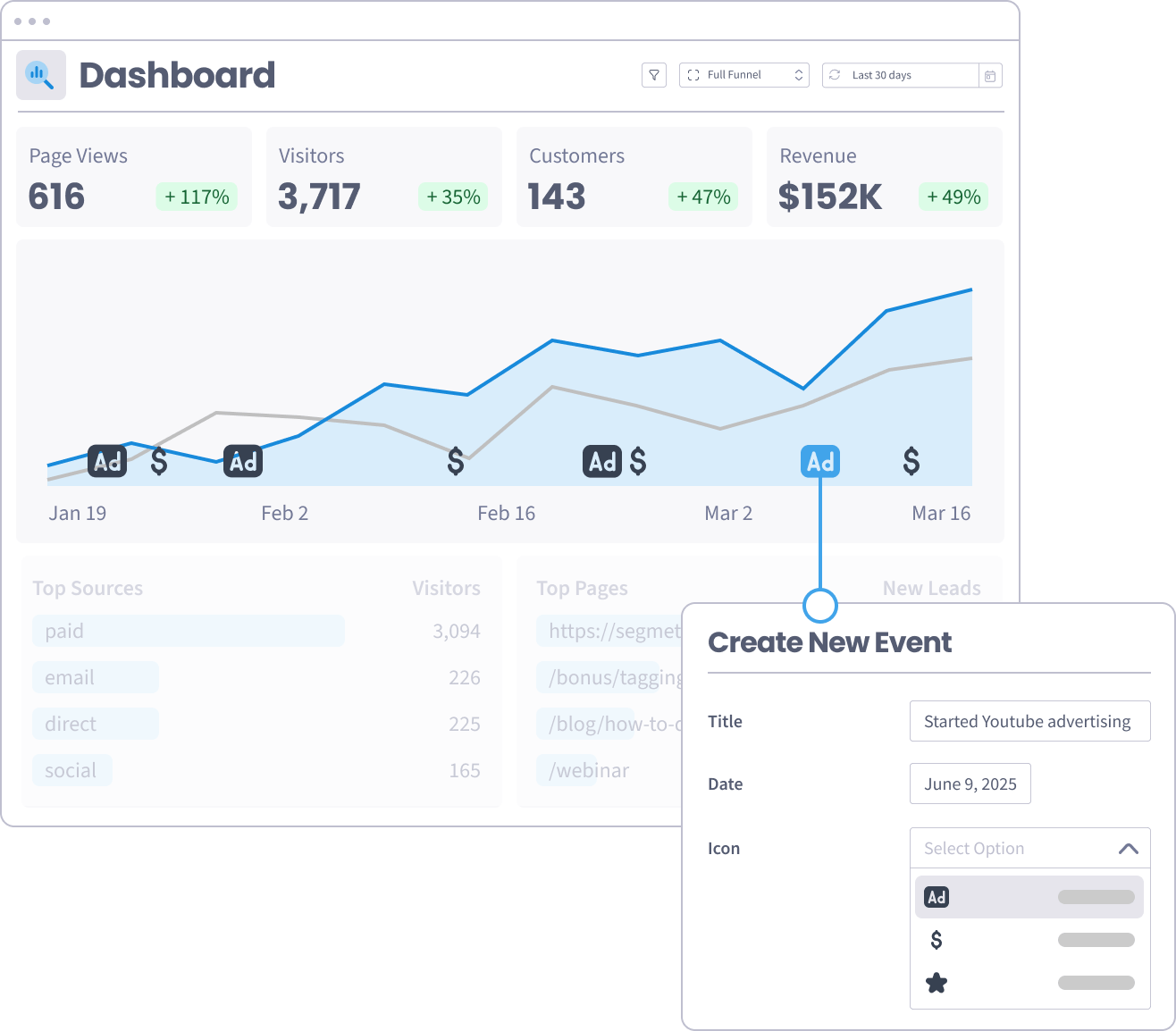 SegMetrics makes it easy to log any marketing change — from ad launches to strategy shifts — and overlay those milestones on your performance data. It’s like having a photographic memory for your marketing. When results shift, everyone on your team will know exactly what changed, when it changed, and why it mattered.