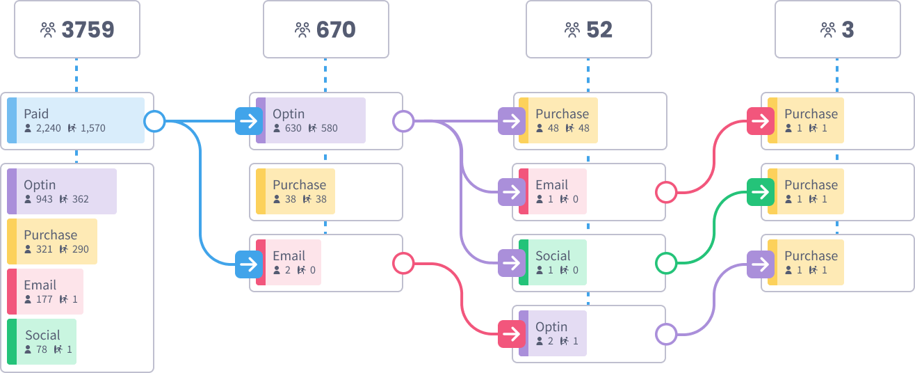 Seeing metrics in isolation only tells part of the story. With Multi-Segment Analysis, you can compare any two data points — like ad, channel, tag, platform, location or product — to uncover powerful patterns between them. This lets you get granular on the exact flows driving your business.